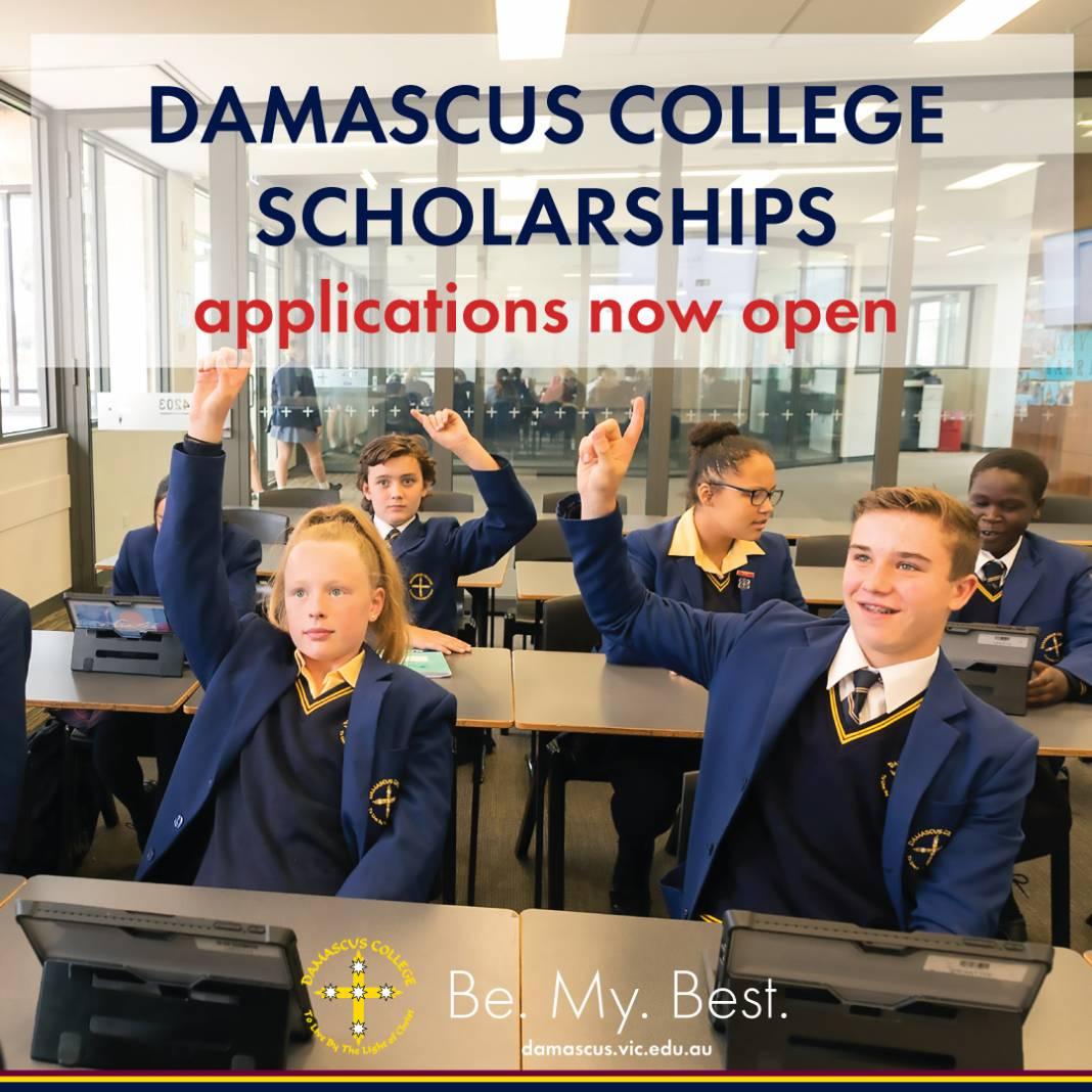 The following Damascus College Scholarships are now open. Students can download and complete the relevant Scholarship cover sheet at https://www.damascus.vic.edu.au/enrolment/scholarships and email it with their application to principal@damascus.vic.edu.au