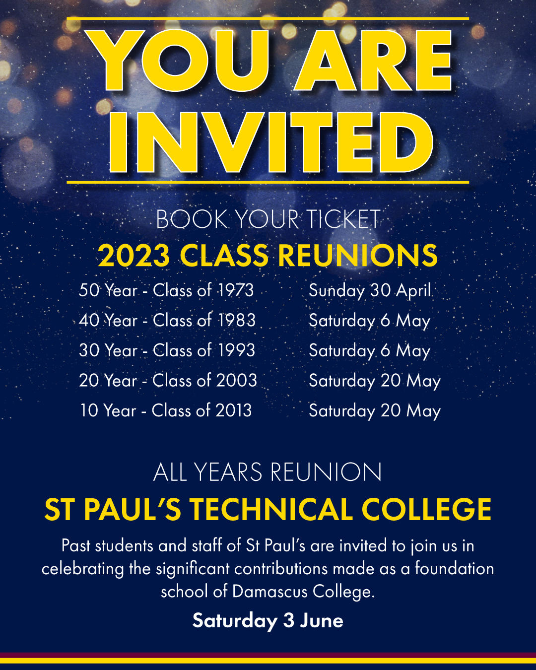 Damascus College is thrilled to invite past students and staff to the following 2023 Class reunions: