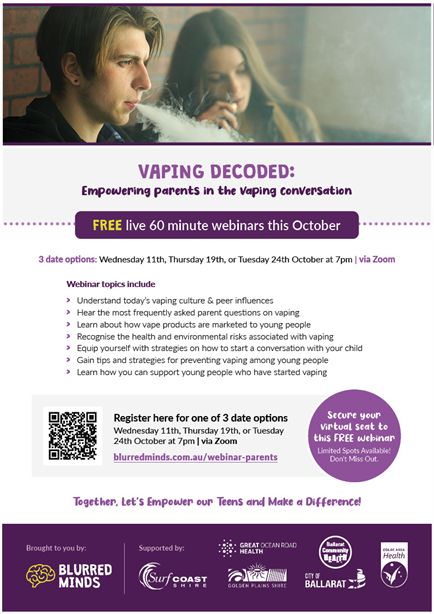 I wanted to draw your attention to a free webinar that is being offered to parents/families/adults on Empowering Parents in the Vaping Conversation. Vaping is becoming a concerning health issue for the young people in our society and it is important that we all share responsibility in empowering students to make better choices when it comes to looking after their health. Details of this event are provided below. There are 3 options available allowing for some flexibility in a suitable date.
