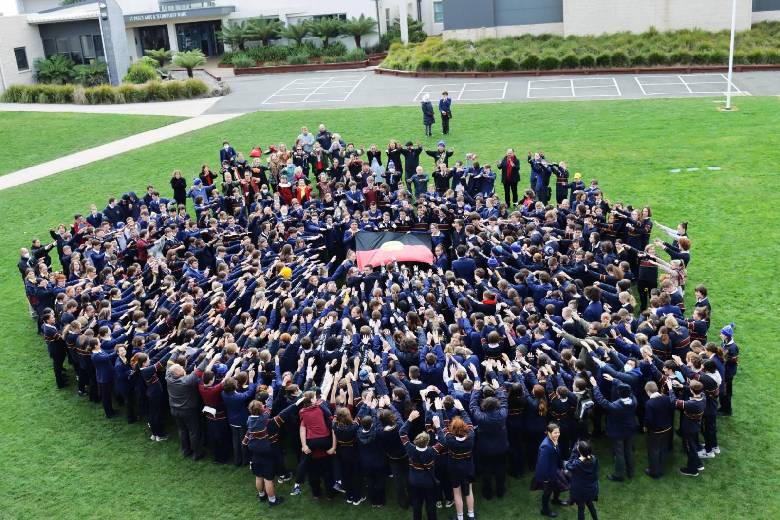 On Friday 3 June, as a symbol of our College’s brave and committed effort to make change, we invited all students and staff to gather around the Aboriginal flag and face inward towards it. We asked that we hold our hands in the direction of the flag above our heads. This is symbolic of our central commitment as individuals, families and community on our pathway to Reconciliation, being a central focus and mission for the Damascus community moving forward.