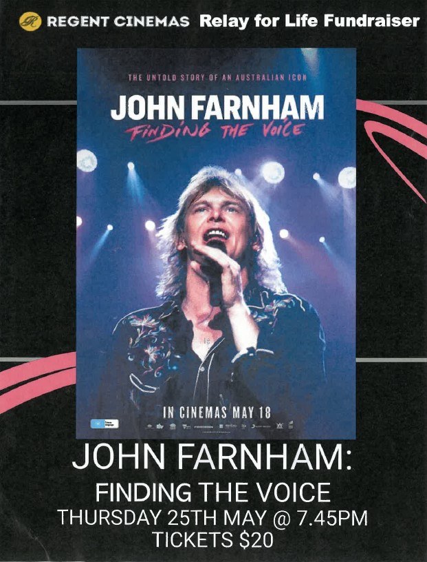 Take the opportunity to see this amazing bio pic around the life of John Farnham and at the same time help raise money for the Relay for Life team.