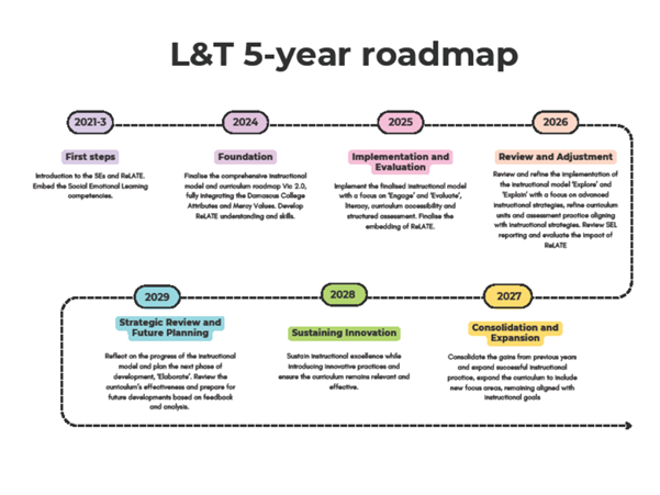 The five-year roadmap prioritises the gradual embedding of this model across all learning areas. In 2025, the focus will be on the first and final phases of the model—Engage and Evaluate—which emphasise activating prior knowledge, ensuring students are prepared for learning, and fostering a reflective practice that helps students assess their progress. By focusing on these phases, the College will support the establishment of strong entry and exit routines, essential for classroom management and creating productive learning environments.