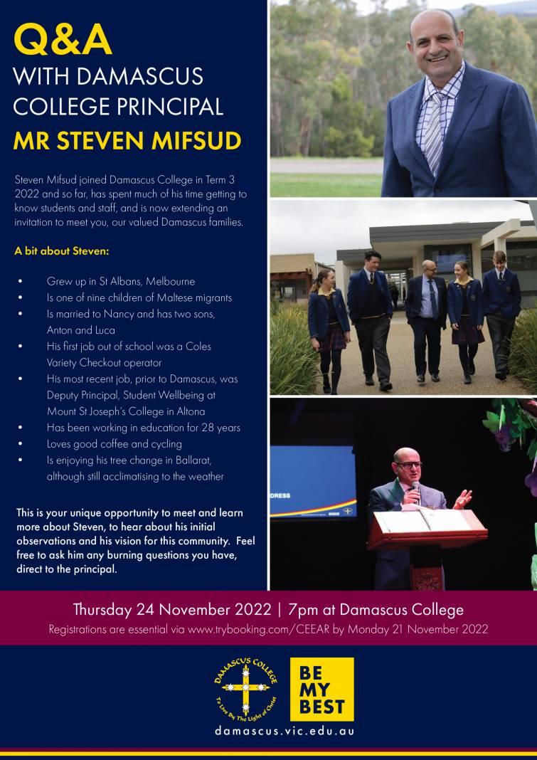 Damascus families are invited to a special Q&A event with the new Damascus College Principal Mr Steven Mifsud.
