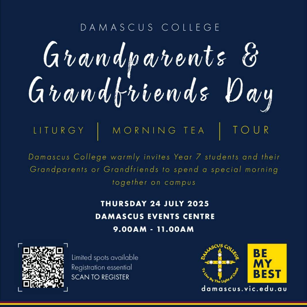 In celebration of World Day for Grandparents, Damascus College warmly invites Year 7 students and their Grandparents or Grandfriends to attend a special celebration on Thursday 24 ...