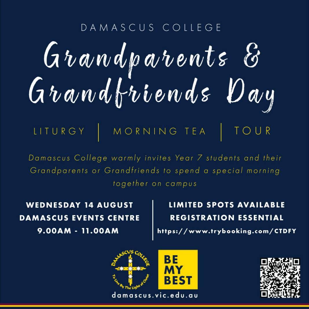 In celebration of World Day for Grandparents, Damascus College warmly invites Year 7 students and their Grandparents or Grandfriends to attend a special celebration on Wednesday 14 August, from 9.00am – 11.00am at the Damascus Events Centre.