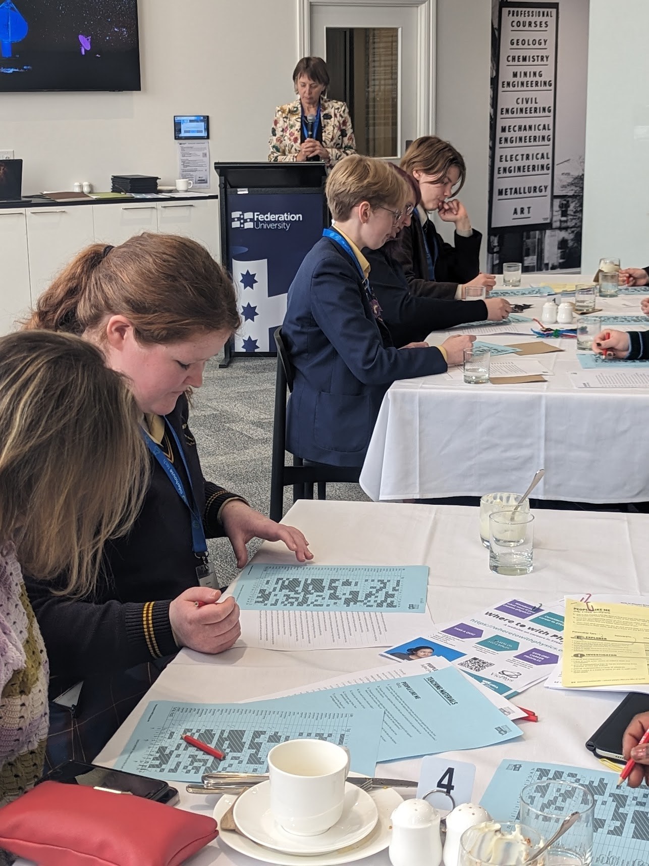 Carley Young, VCE Physics teacher, and 3 VCE students attended the Girls in Physics Breakfast event, run by VicPhysics, at the SMB Fed Uni campus on Friday 25th August, 2023. Attendees were supplied a very delicious buffet style breakfast, coffee, tea and good conversation with students from other Ballarat schools and STEM industry professionals. The morning stated off with a tower building exercise using pipe-cleaners, in which the teacher table came a close second.