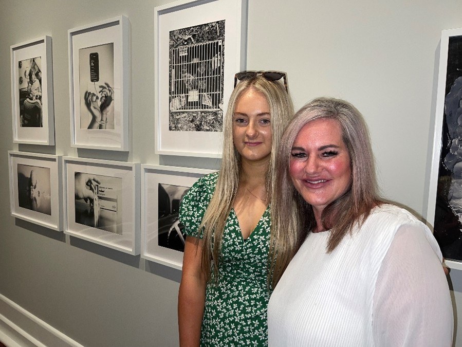 Pictured below: Samantha Dechene poses with her proud mother, Dayna Mollison next to Samantha multi-perspective artwork ‘ Stigma’ commenting on the detrimental effects of addiction. Dayna can be seen in two of the artworks as one of Samantha’s models.