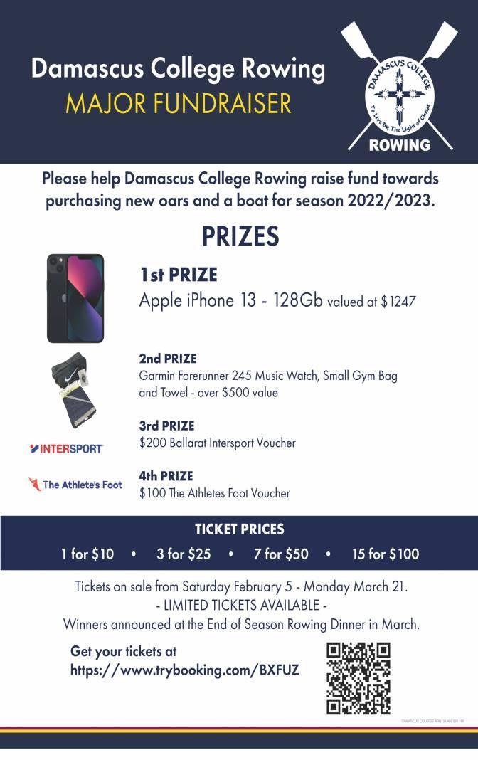 Please help Damascus College Rowing raise funds towards purchasing new oars and a bear for the 2022 / 2023 season. To purchase tickets click here or scan the QR code below. There...