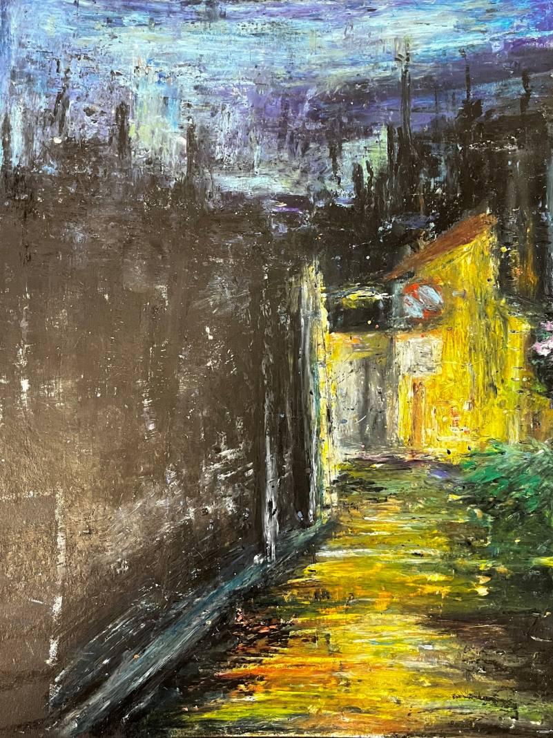 The task we were set was to create an urban landscape at night. I added and then removed the pastel with a plastic ruler to add a scratchy, textural surface. I also blended the oil pastel to create layers and to mix colours. I didn’t want to add too much detail into the buildings, so as to create an ominous, ambiguous landscape for the viewer to interpret. Overall, I really enjoyed creating this piece and loved exploring the medium of oil pastel.